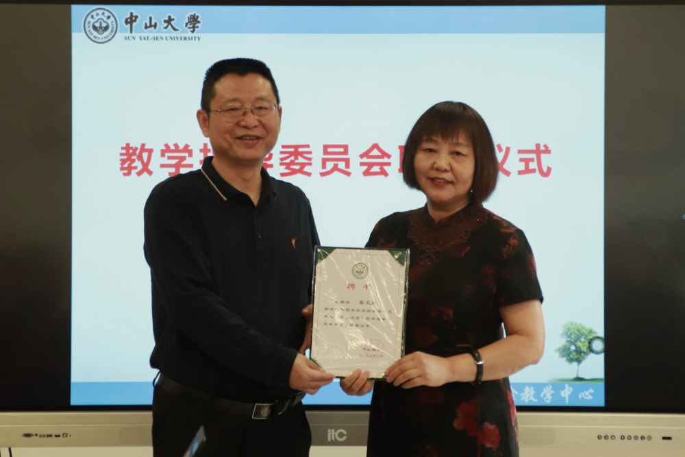 黄林冲处长宣读了“中山大学关于聘任化学国家级实验教学示范中心教学指导委员会委员的通知”,聘任湖南大学郭栋才教授、武汉大学黄驰教授、大连理工大学姜文风教授、四川大学郑成斌教授、复旦大学孙兴文教授、中山大学朱芳教授、李厚金副教授等7人为化学国家级实验教学示范中心(中山大学)教学指导委员会委员。黄林冲处长、苏成勇院长和冯双书记一同为新一届教学指导委员会委员颁发了聘书。