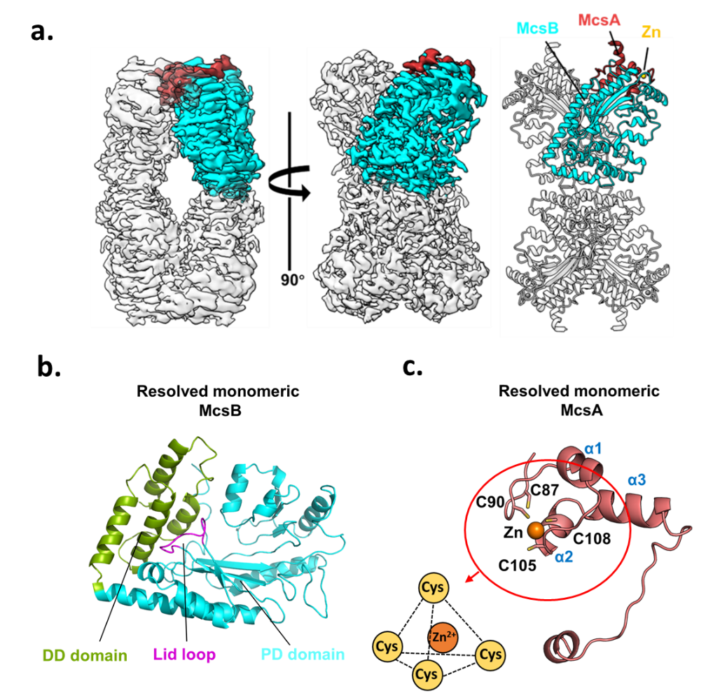 1. McsA-McsB复合体的整体结构。a. McsA-McsB复合物结构;b. McsB 单体结构;c. McsA 部分单体结构(含锌指结构域)。