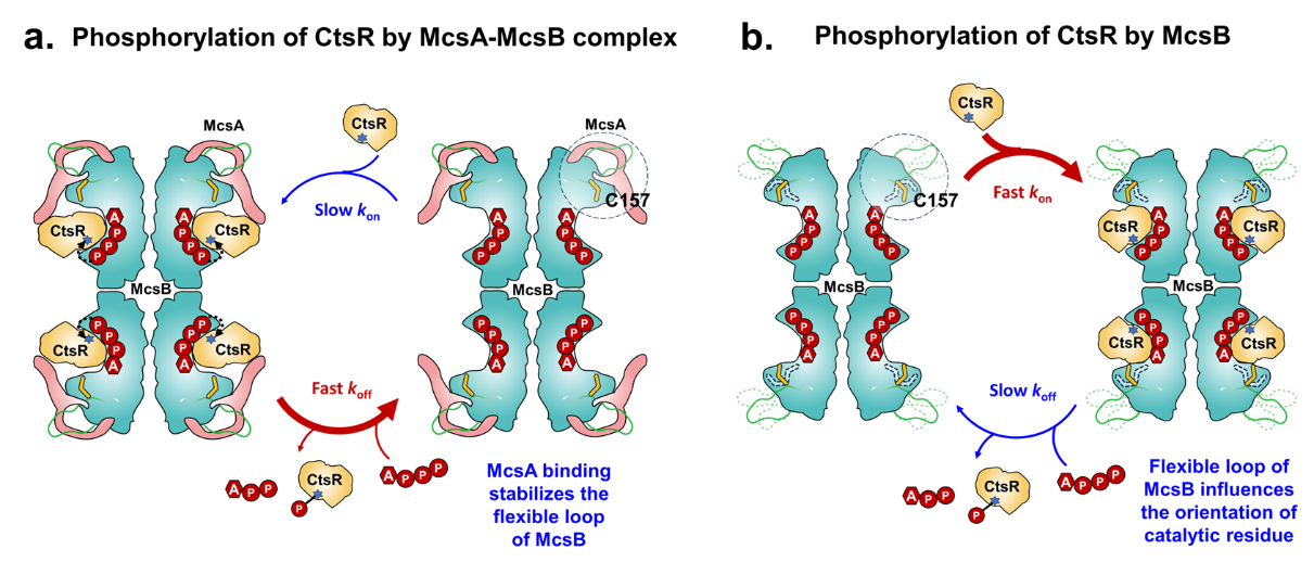此项工作首次解析了激酶复合物McsA-McsB的冷冻电镜结构,揭示了McsA通过锌指结构域及α螺旋与McsB结合,稳定了McsB的关键催化半胱氨酸残基C157并显著降低了底物蛋白CtsRMcsB的结合能力,加速磷酸化CtsR的离去速率,从而增强McsB的精氨酸激酶活性,实现对CtsR的磷酸化修饰。这种磷酸化修饰通过McsA激活McsB后对CtsR的精准调控,使得CtsR的抑制作用得以解除,从而迅速响应环境变化,有效维持了细胞内蛋白质的质量和功能稳定。