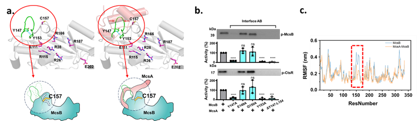 2. McsB的长环区参与McsA结合。a. McsBMcsA-McsB结构示意图;b. McsB及突变体的酶活实验;c. 分子动力学模拟。