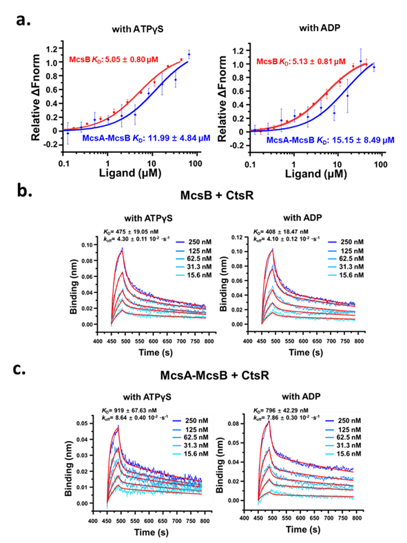 3. McsA降低底物CtsRMcsB的结合亲和力。a. 1 mM ATPγSADP存在下,McsBMcsA-McsB复合物与CtsR相互作用的微量热涌动曲线;b, c. 1 mM ATPγSADP存在下,McsBb)和McsA-McsB复合物(c)与CtsR相互作用的生物层干涉曲线。