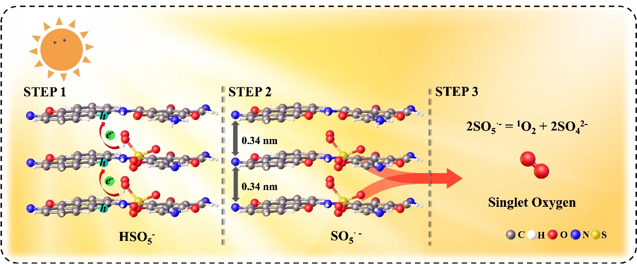 单线态氧(1O2)因具有较长的寿命、较宽的pH适应范围、较高的选择性以及对阴阳离子和有机质的高抗性而被广泛应用于水污染治理领域。此前已有报道过一硫酸盐(PMS)可以被有机醌中的C=O基团活化并进一步生成1O2(2SO5·- → 1O2 + 2SO42-),但C=O基团在催化剂表面的分布通常是稀疏且随机的,这种随机性增加了自由基前驱体(SO5·-)在有效相互作用之前被湮灭的可能性,严重阻碍了1O2的高效生成。因此构建短距离的快速反应体系以提高1O2的产率仍然具有很大的挑战性。