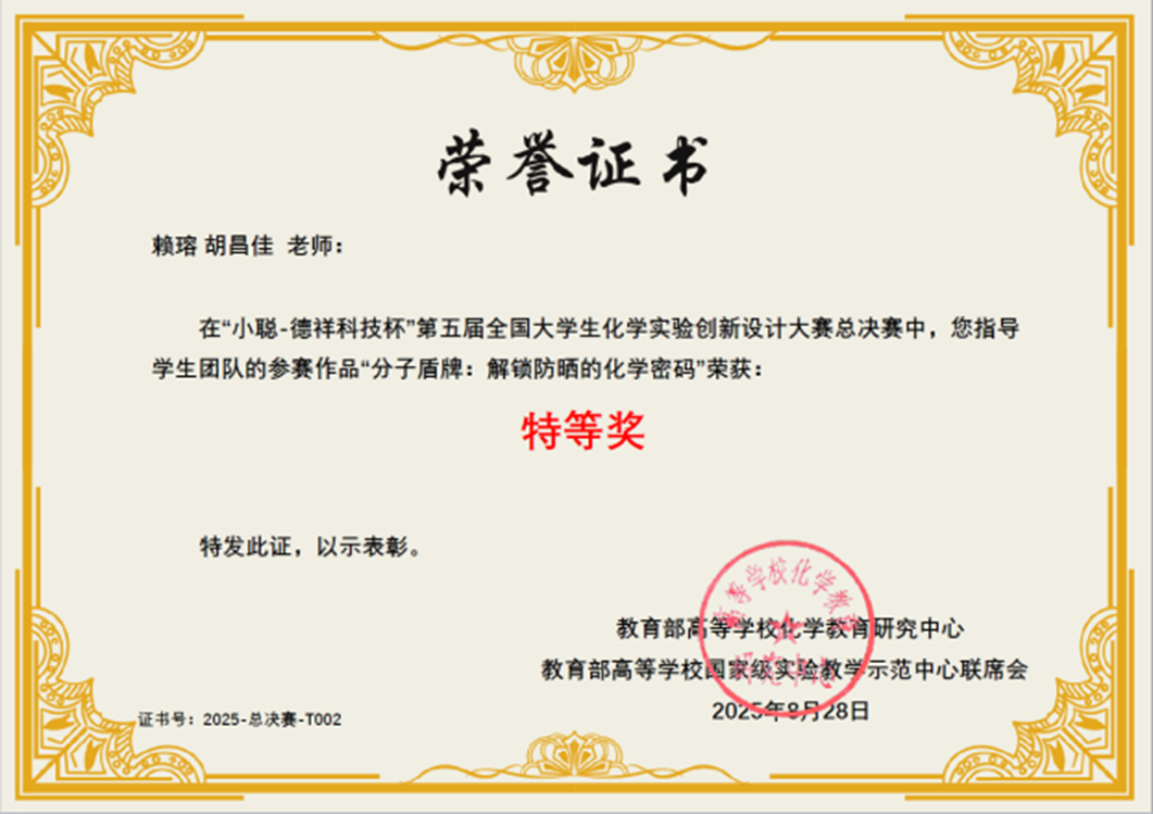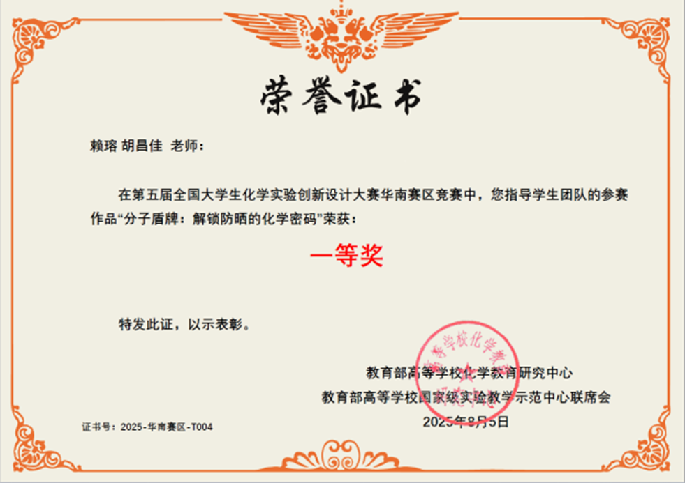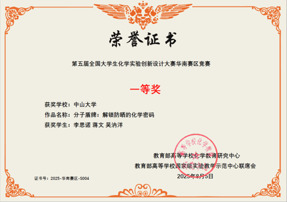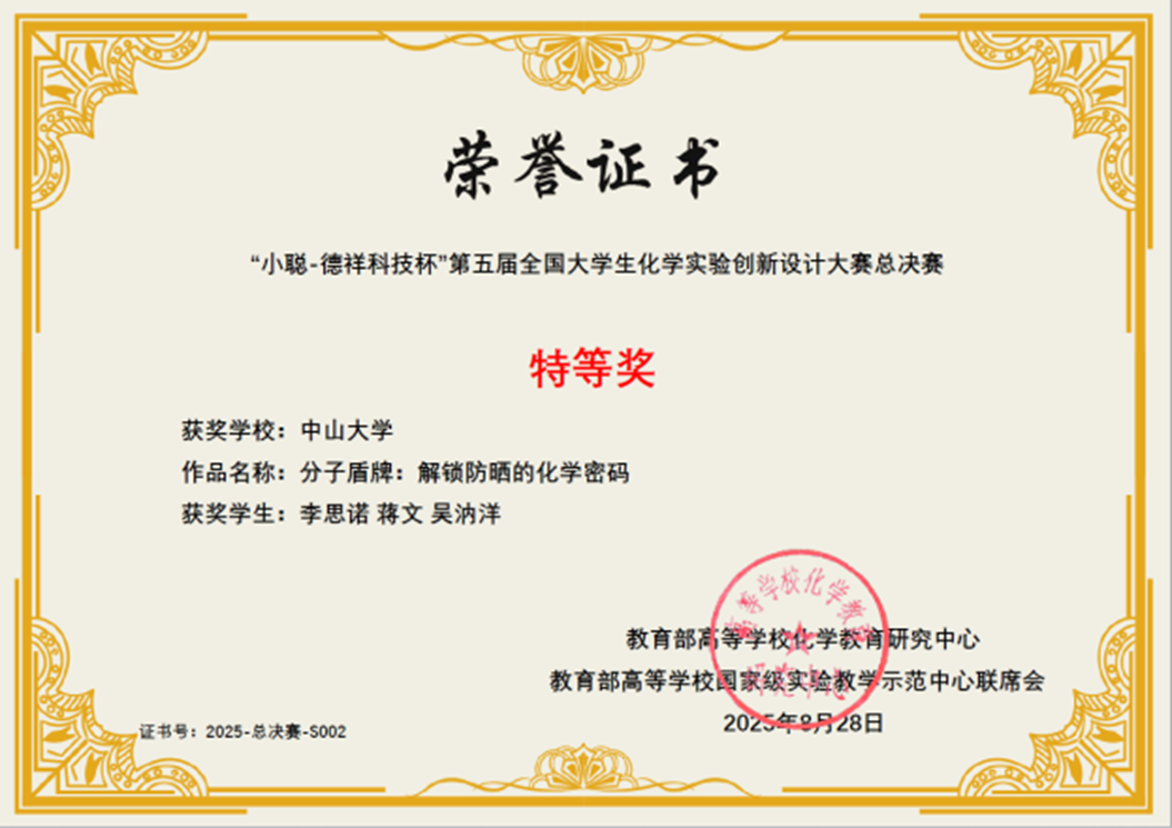 导航痕迹 中山大学 化学国家级实验教学示范中心  化学竞赛  “微瑞杯”第五届 (2024年和2025年) 全国大学生创新实验设计竞赛  中山大学-科普实验-总决赛特等奖 扫描此二维码分享 中山大学-科普实验-总决赛特等奖 发布人:网站管理员 发布日期:2025-10-09 分子盾牌:解锁防晒的化学密码