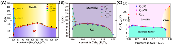 近期中山大学材料科学与工程学院罗惠霞教授课题组开发了一系列层状碲化物新超导材体,并通过电子/空穴掺杂调控,系统研究了超导电性与电荷密度波的竞争作用。罗惠霞教授团队发现准二维CuIr2Te4化合物同时具有电荷密度波相变和超导电性,其电荷密度波相变温度大约在250 K,超导转变温度在2.5 K左右(Physical Review B, 2019, 100, 174504)。在此研究基础上,罗惠霞教授课题组分别在Cu位,Ir位和Te位掺杂Zn,Ti和I,进一步成功获得Cu1-xZnxIr2Te4,CuIr2-xTixTe4和CuIr2Te4-xIx过渡金属新碲化物。研究发现Cu位掺杂Zn,成功抑制了CDW,同时提高了超导电性,最大超导转变温度达到2.82 K,而且超导电性出现在整个掺杂浓度区域。另一方面,Ir位掺杂部分Ti元素,也是可以成功抑制CDW,并出现穹顶形状的具体掺杂超导相图,此相图与典型高温超导的掺杂相图十分相似。然而,研究发现Te位掺杂I,首先CDW相变被抑制,但是CDW在过掺杂区域又重新出现,并且在过掺杂区域的CDW相变温度随着掺杂浓度的升高而升高,在两端电荷密度区域之间同样出现呈现穹顶形状的超导相图,最大超导转变温度达到2.95 K。该研究不仅为过渡金属碲化物超导材料的家族增加了新成员,而且为进一步研究超导电性和电荷密度波的竞争机制以及相关量子态的研究提供理想的材料平台。此外,该碲化物超导材料的掺杂相图与高温超导相图类似,有助于人们理解高温铜基或铁基超导的磁性与超导的竞争机制。